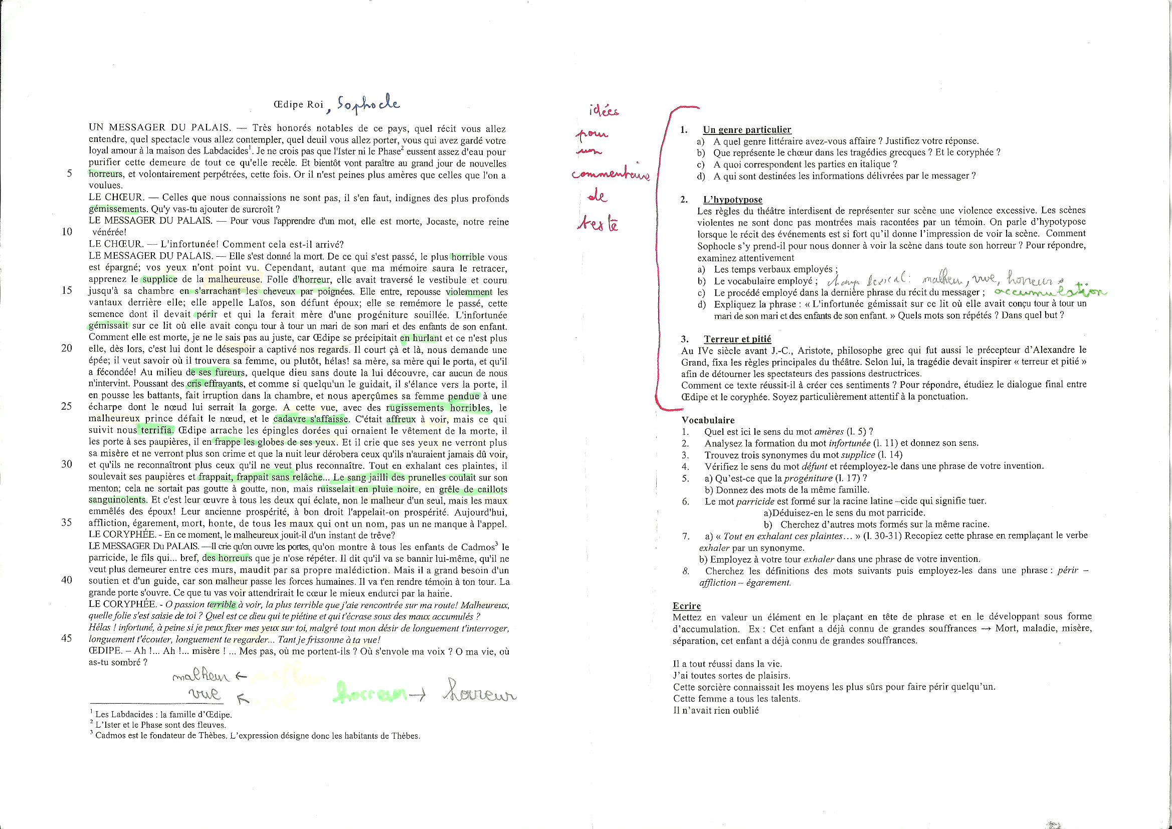 Texte de Sophocle : - Un messager du palais , - le choeur , - le coryphée ,-Oedipe